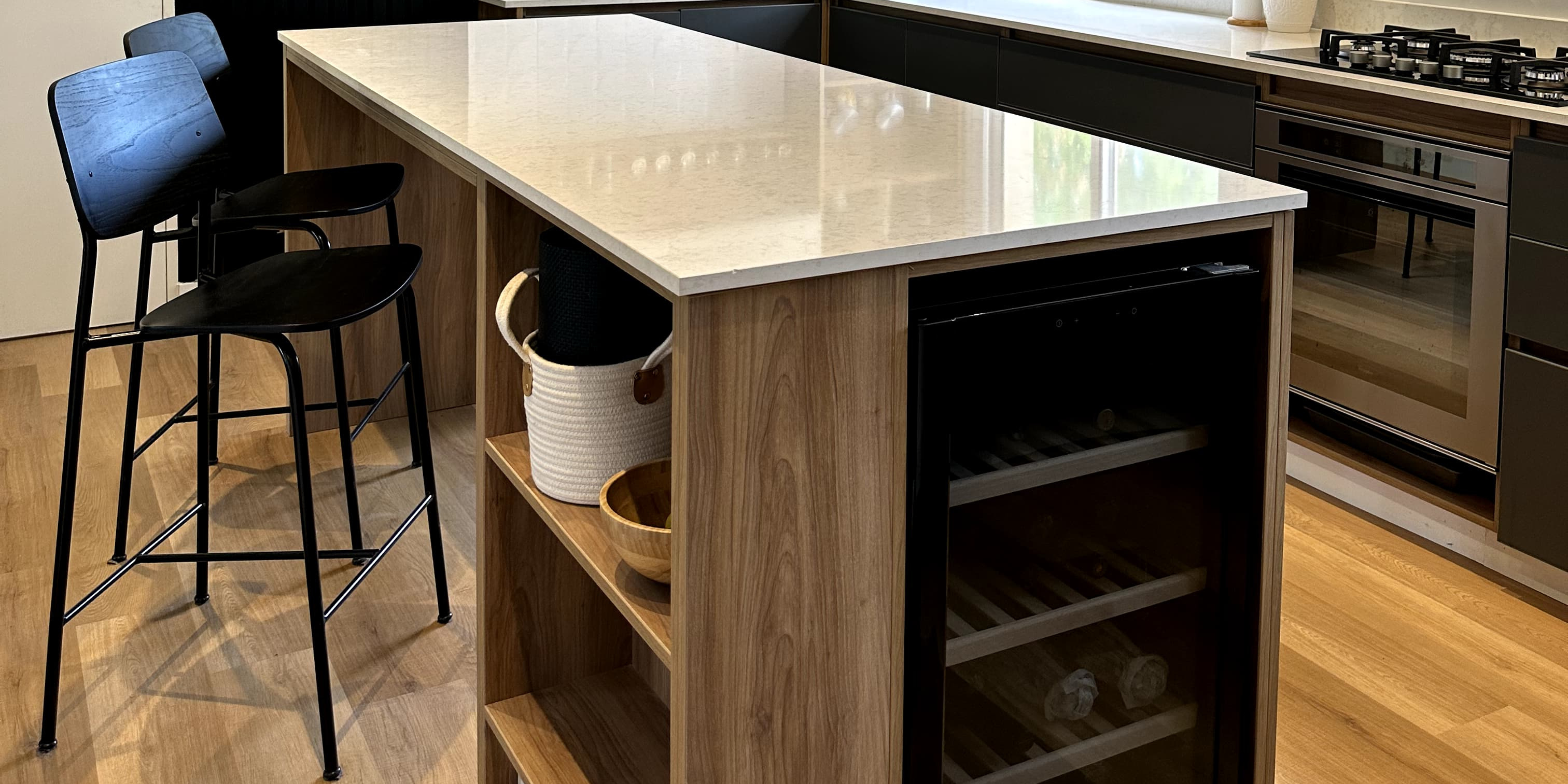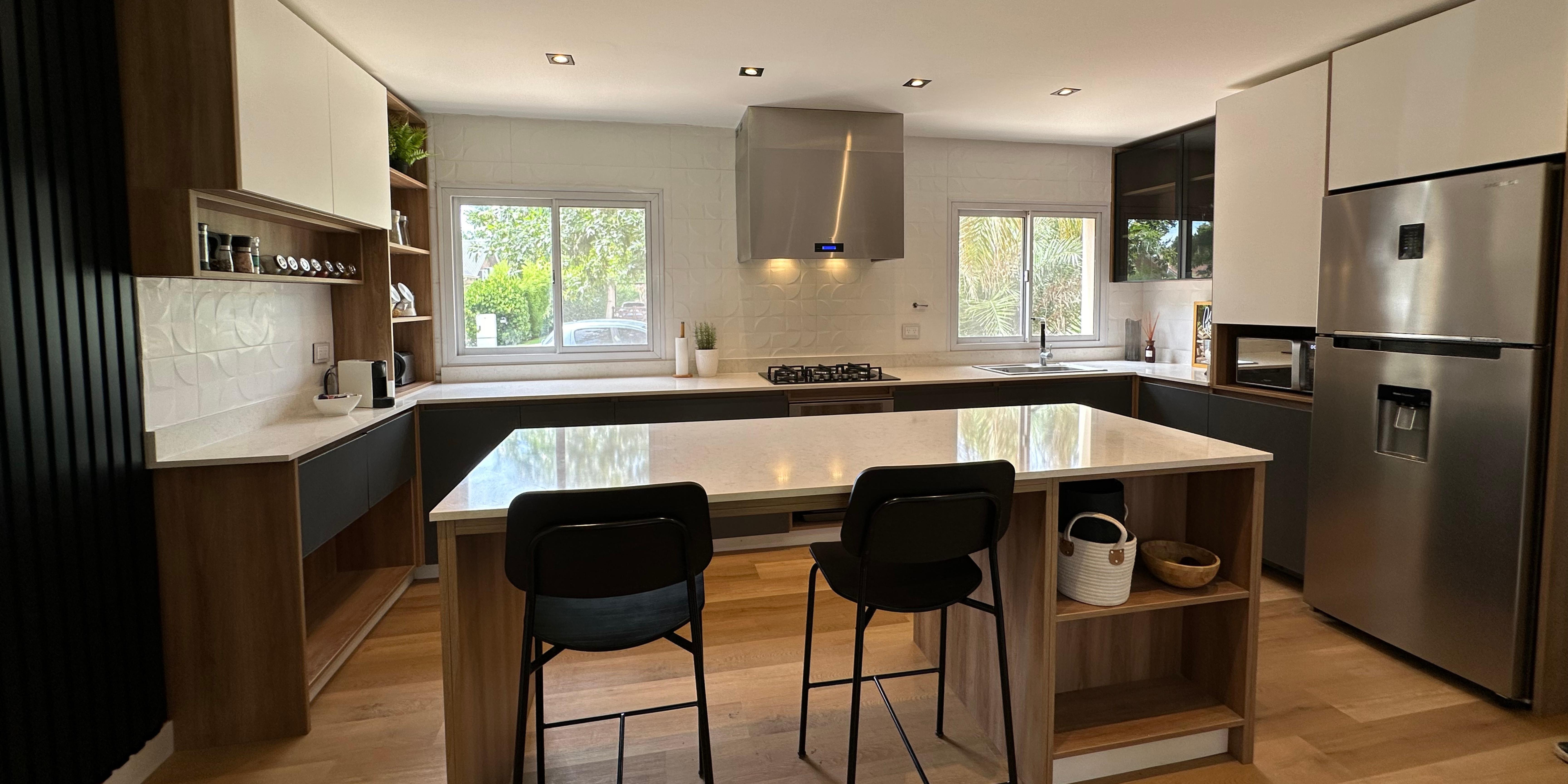 Una Isla central que domina el espacio, justamente diseñada para ser el centro de atención con la integración de una vinoteca. La luz se refleja en todas las superficies acentuando la amplitud del lugar. Los colores claros y cálidos generan un ambiente acogedor. Un gran trabajo de la Arquitecta Valentina Ferreira.